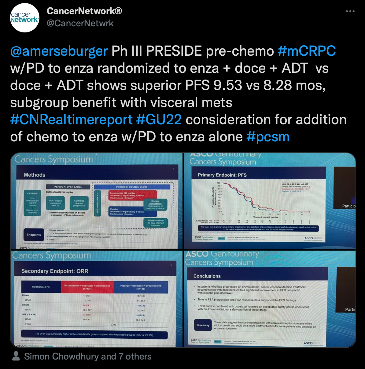 “Ph III PRESIDE pre-chemo #mCRPC w/PD to enza randomized to enza + doce +ADT vs doce + ADT shows superior PFS,” Gong wrote.