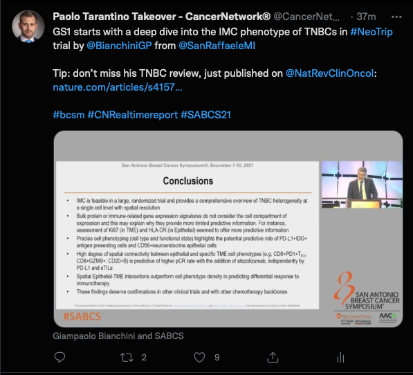Tarantino began the discussion with the first look at data from the phase 3 NeoTRIPaPDL1 trial (NCT02620280). “GS1 starts with a deep dive into the IMC phenotype of TNBCs in #NeoTrip trial by @BianchiniGP from @SanRaffaeleMI,” he wrote.