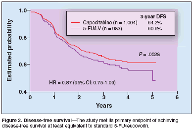 The principal endpoint was disease-free survival (relapse-free survivalplus all deaths from other causes),with the aim being to demonstratethat oral capecitabine was at least equivalent in efficacy to 5-FU/LV; inaddition, secondary efficacy measuresincluded overall survival and relapsefreesurvival (relapses or new coloncancer plus all deaths due to coloncancer or treatment).In the intent-to-treat analysis, disease-free survival with capecitabine was not only equivalent to 5-FU/LV,but at 3 years showed a definite trendtoward superiority-64.2% vs 60.6%,hazard ratio (HR) 0.87-almost reachingstatistical significance (P = .0528).This was confirmed in the per-protocolpopulation, in which the hazardratio for disease-free survival for patientson capecitabine was 0.89.Superior Relapse-Free SurvivalSimilar treatment-related differences,in favor of capecitabine, werealso observed in the intent-to-treatanalysis for 3-year relapse-free survival(65.5% vs 61.9%, HR = 0.86), whichwas significant at P = .0407, and overallsurvival (81.3% vs 77.6%, HR =0.84, P = .0706). Subgroup analysisalso confirmed the superiority ofcapecitabine, irrespective of gender,age group, nodal status, and level ofcarcinoembryonic antigen (CEA).Oral capecitabine also showed animproved safety profile, comparedwith the traditional 5-FU/LV regimen,with significantly fewer adverse eventsin nearly all categories, including diarrhea,stomatitis, neutropenia, nauseaand vomiting, and alopecia (P