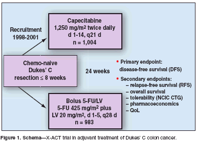 NEW ORLEANS-As adjuvanttherapy for colon cancer, oral treatmentwith capecitabine (Xeloda) is atleast equivalent to an intravenouslyadministered bolus of 5-fluorouracilplus leucovorin (5-FU/LV), the longtermstandard of care. This is the principalconclusion drawn from the phaseIII X-ACT Trial (Xeloda in AdjuvantColon Cancer Therapy).Jim Cassidy, MD, of the Universityof Glasgow, Scotland, presented theresults at the 40th Annual Meeting ofthe American Society for Clinical Oncology(abstract 3509). "In my opinion,"Dr. Cassidy said, "capecitabineshould replace bolus 5-FU/LV in theadjuvant treatment of Dukes' C coloncancer."The multicenter trial, involving investigatorsin 164 centers, enrolled1,987 patients with resected Dukes' Ccolon cancer. Within 8 weeks of tumorresection, patients were randomizedto oral capecitabine (1,250 mg/m2 twice daily for 14 days, every 3weeks) or to the Mayo Clinic regimenof intravenous 5-FU/LV (5-FU 425mg/m2/LV 20 mg/m2 days 1 to 5, every4 weeks); treatment continued for 24weeks, for a total of eight cycles ofcapecitabine and six cycles of 5-FU/LV.Patients were followed for a medianof 3.8 years. In both groups, thegreat majority completed the fullcourse of treatment (84% in thecapecitabine arm vs 88% in the 5-FU/LV arm), although dose managementwas required, with 57% of capecitabinepatients and 52% of 5-FU/LVpatients requiring dose reduction, delay,or interruption at some point duringthe trial. Dr. Cassidy pointed outthat the oral formulation of capecitabinewas particularly advantageous infacilitating this dosage management,permitting patient involvement inmaintenance of the protocol.