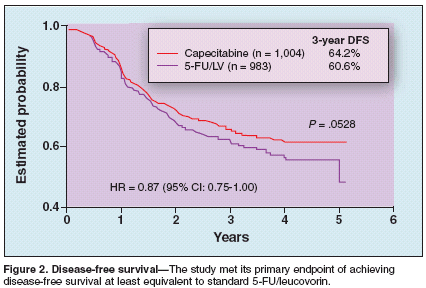 All patients in X-ACT had chemotherapy-naive Dukes' C colon cancerwith curative resection and were randomizedto capecitabine or bolus 5-FU/leucovorin.Capecitabine was given at a dosageof 1,250 mg/m2 twice daily for 14 daysin a 21-day cycle. Alternatively, patientsreceived the Mayo Clinic regimenof 5-FU 425 mg/m2 and leucovorin20 mg/m2, given on days 1 to 5every 28 days. In total, both patientgroups received 24 weeks of treatment(eight cycles of capecitabine or six cycles of 5-FU/LV).Median age of patients in X-ACTwas approximately 62 years and 85%were Eastern Clinical Oncology Group(ECOG) performance status (PS) 0,with 15% having a PS of 1. More than80% of patients had normal carcinoembyronicantigen (CEA) and the majority(76%) had T3 disease. Medianfollow-up at the time of this analysiswas 3.8 years.While the primary endpoint ofequivalence in disease-free survival wasmet, relapse-free survival actually metstatistical criteria for superiority favoringcapecitabine. Three-year relapse-free survival was 65.5% forcapecitabine vs 61.9% for 5-FU/leucovorin(HR = 0.86, 95% CI 0.74-0.99, P = .0407). "At least for thisparticular endpoint, capecitabine isclearly superior to the Mayo Clinicregimen," Dr. Cassidy said. The differencetranslates into a 14% reductionin risk of relapse from colon can-cer among patients treated withcapecitabine.Overall survival also showed atrend in improvement favoringcapecitabine. Three-year overall survivalwas 81.3% for capecitabine and77.6% for 5-FU/leucovorin (HR =0.84, 95% CI 0.69-1.01, P = .0706).This difference translates into a 16%reduction in risk of death comparedto IV 5-FU. "We need to follow thepatients longer," Dr. Cassidy said,"[but] the separation [in survivalcurves] is in the direction of an advantagefor capecitabine."Capecitabine also offered an improvedside effect profile. Previouslypublishedsafety results (Ann Oncol14(12):1735-1743, 2003), show thatthere was significantly less diarrhea,stomatitis, neutropenia, nausea/vomiting,and alopecia in the capecitabinearm vs the 5-FU/leucovorin arm (P Potential Criticisms Addressed