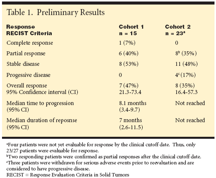 Evaluation and ResponsePatients were evaluated weekly for toxicityand then every 6 weeks for responseby magnetic resonance imaging (MRI),computed tomography (CT) scan/x-ray.Tumors were assessed based on theRECIST criteria (Response EvaluationCriteria in Solid Tumors) for response,and safety and survival status was evaluatedin all patients who receive at least onedose of study medication and had followupdata.The objective of the study was to evaluatethe overall objective response ratefor capecitabine plus irinotecan as firstlinetherapy for metastatic colorectal cancerpatients, and to evaluate the safetyprofile of the regimen. An additional objectivewas to describe expression of severalbio-markers-thymidylate synthase,thymidine phosphorylase, dihydropyrimidinedehydrogenase-that are potentially predictive of capecitabine activity.This final objective was based on a mandatorybiopsy of metastatic sites.Preliminary results are available forcohorts one and two, although cohort two will continue accrual until 50 patients areenrolled. In cohort one, complete responsewas seen in one patient (7%), partialresponse in six patients (40%), stabledisease in eight (53%), and progressivedisease in none. None of the patients incohort two had complete response, eight(35%) had partial response, 11 (48%) hadstable disease, and four (17%) had progressivedisease. Overall response was 47%(7 patients) for cohort one, and 35% (eightpatients) for cohort two (see Table 1).For cohort one, the median time toprogression was 8.1 months and medianduration of response was 7 months. Thesedata are not yet available for cohort two.Early Recognition ofAcceptable ToxicityIn cohort one, grade 3/4 toxicities werediarrhea (eight), dehydration (four), febrileneutropenia/sepsis (two), anorexia(one), depression (one), mucosal inflammation(one), renal failure (one), andcolitis (one). In cohort two, with reduceddoses but a larger number of patients,grade 3/4 toxicities were diarrhea (11),hand-foot syndrome (two), dehydration(two), deep vein thrombosis (two), andfebrile neutropenia/sepsis (one). Earlyrecognition of unacceptable toxicity incohort one highlights the importance andfeasibility of continuous adverse eventmonitoring in multicenter studies.In summarizing the preliminary resultsof the study, Dr. Gold said, "Thecombination of capecitabine and irinotecanhas activity in patients with metastaticcolorectal cancer. Once the startingdose was reduced, the combination waswell tolerated. After the study has accrued50 patients for cohort 2, then biomarkeranalysis will be performed. We will seekto determine whether biomarker assessmentmay be predictive of capecitabineactivity."