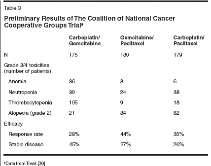 Treat J, Belani CP, Edelman MA, et al:A randomized phase III trial of gemcitabine (G)in combination with carboplatin (C) orpaclitaxel (P) versus paclitaxel plus carboplatinin advanced (stage IIIB, IV) non-small cell lungcancer (NSCLC) (abstract 2511). Proc Am SocClin Oncol 22:624, 2003.