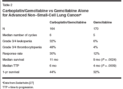 Sederholm C: Gemcitabine (G) comparedwith gemcitabine plus carboplatin (GC)in advanced non-small cell lung cancer(NSCLC): A phase III study by the SwedishLung Cancer Study Group (SLUSG) (abstract1162). Proc Am Soc Clin Oncol 21:291a, 2002.