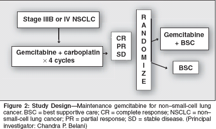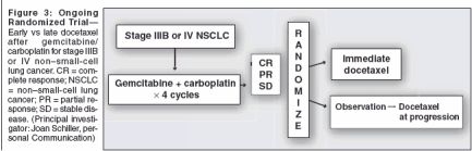 ABSTRACT: The treatment of advanced nonâsmall-cell lung cancer (NSCLC)has evolved rapidly over the past few years. Systemic chemotherapy isassociated with both quality of life and modest survival benefit for patientswith advanced NSCLC. Platinum-based doublet combinationsare the “standard of care.” The US Food and Drug Administration(FDA) has approved gemcitabine (Gemzar), a pyrimidine analog, to beused in combination with cisplatin for the treatment of advanced NSCLCin the first-line setting. Randomized clinical trials have established comparableefficacy with improved therapeutic index for the carboplatin/gemcitabine regimen when compared with cisplatin/gemcitabine andother platinum doublets. Nonhematologic toxicities occur at a lowerfrequency with carboplatin/gemcitabine combinations compared withother “standard” platinum-based doublets, whereas dose-limitingthrombocytopenia, the most common toxicity, rarely requires therapeuticintervention. Both the 3- and 4-week schedules of carboplatin/gemcitabine result in similar efficacy and toxicity profiles, but the3-week regimen is preferred. The combination of carboplatin andgemcitabine is an effective regimen with an acceptable toxicity profilefor the treatment of advanced NSCLC. This regimen can also be usedas a foundation for the development of innovative combinations withmolecularly targeted agents.