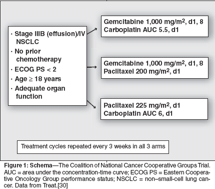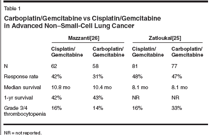 Mazzanti P, Massacesi C, Rocchi MB,et al: Randomized, multicenter, phase II studyof gemcitabine plus cisplatin versusgemcitabine plus carboplatin in patients withadvanced non-small cell lung cancer. LungCancer 41:81-89, 2003.