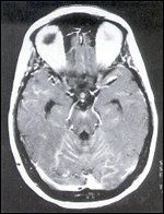 The woman’s CSF examination revealed an opening pressure of 390 mm H2O, protein of 67 mg/dL, glucose of 40 mg/dL, and no white blood cells but a positive cytology for adenocarcinoma cells consistent with a primary breast tumor. Magnetic resonance imaging (MRI) of the brain and spine were initially normal. She received a ventriculo-peritoneal shunt with an on-off valve. This relieved her headaches and vertigo. She was initially treated with intrathecal methotrexate at 12 mg weekly; she could tolerate having the shunt valve turned off for only 60 to 90 minutes. Immediately after her fourth dose of intrathecal methotrexate, she developed acute headache, nausea, and fever. These symptoms cleared over 24 hours, and she was subsequently treated with thiotepa at 10 mg weekly.