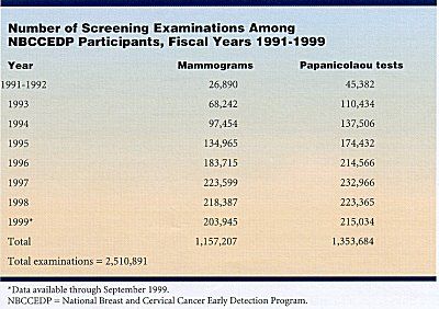 WASHINGTON-More than 2.5 million mammograms and Papanicolaou tests were provided to women in the first 9 years of the National Breast and Cervical Cancer Early Detection Program (NBCCEDP), managed by the Centers for Disease Control and Prevention (CDC). The total includes 1,157,207 mammograms and 1,353,684 Pap tests administered from 1991 through September 1999.
