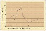 Transient elevations in CEA have been noted in patients with resected colorectal cancer during adjuvant therapy. Figure 1 illustrates a surge in CEA during adjuvant bolus fluorouracil (5-FU) therapy in a patient with a resected rectal cancer. The surge in this case lasted for several weeks and resolved spontaneously; the patient remains free of disease more than 1 year later. In the follow-up of 1,017 patients with resected colon cancer, Moertel et al described a 16% false-positive rate of CEA elevation when a cutoff of 5 ng/mL was used and a 4% false-positive rate when 10 ng/mL was used.[22] This was attributed to 5-FU and levamisole in the majority of cases.[22] These findings are consistent with preclinical data demonstrating an increased expression of CEA in response to chemotherapy exposure when agents such as 5-FU and platinum drugs are used.[70,71]