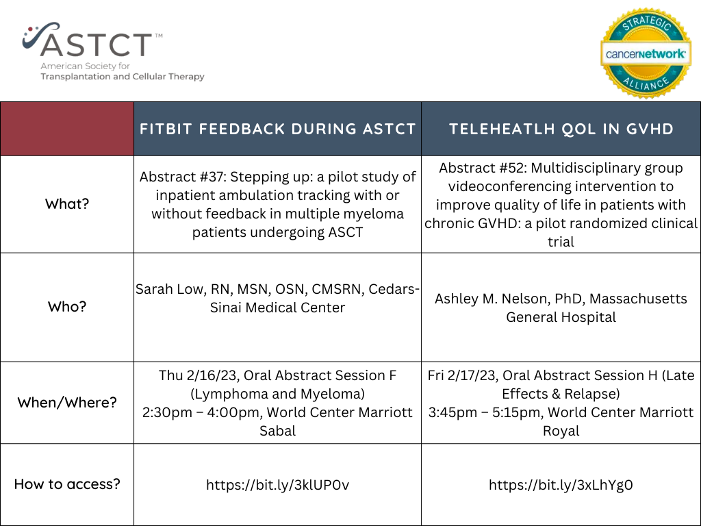 This year, we’re even more excited to see not one but two digital health abstracts chosen for oral presentation at #Tandem23! On Thursday, a randomized trial of Fitbits with visual feedback versus Fitbits alone during hospitalization for autologous stem cell transplantation (ASCT) is being presented by Sarah Low, RN, MSN, of Cedars-Sinai. On Friday, a randomized trial of a group videoconferencing program for patients with chronic graft-versus-host disease (cGVHD) versus ‘enhanced usual care’ is being presented by Ashley Nelson, PhD, of Massachusetts General Hospital. We interviewed both authors to learn more. (Responses edited for clarity.)