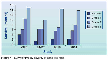 CHICAGO-Separate reviewsof data from multiple phase IItrials with novel agents cetuximab (Erbitux)and erlotinib (OSI-774, Tarceva)have concluded that patients whodeveloped an acne-like rash lived longerthan those who did not, and that patients with more severe rash livedlonger than patients with mild rash(Figure 1).In presenting their analyses at the39th Annual Meeting of the AmericanSociety of Clinical Oncology (ASCO)(abstracts 786 and 817), the investigatorssuggested that rash could be abiomarker for response to HER1/epidermal growth factor receptor inhibitors(HER1/EGFR). Rash also wasidentified as a predictor of response togefitinib (ZD1839, Iressa), a thirdagent that targets EGFR (J ClinOncol21(10):1980-1987, 2003).The big question is whether theobservation will prove clinically useful.Both groups of researchers speculatedthat the optimal dose of HER1/EGFR inhibitors could be linked to anoptimal degree of rash in each patient,but they cautioned that the rash mightbe a surrogate for another factor involvedin the response."It could mean that a strategy forimproving the effectiveness of the drugcould be to dose to a certain level ofrash... in order to escalate to a degreeof side effect that will be commensuratewith a higher degree of activity,"said Leonard B. Saltz, MD, associateattending physician, Memorial Sloan-Kettering Cancer Center.Alternative Hypothesis"An alternative hypothesis wouldbe that patients have particular polymorphismsof the epidermal growthfactor receptor that make them morevulnerable to toxicity and their tumorsmore vulnerable to the attack bythis particular drug," Dr. Saltz continued."We really don't know if thisobservation will have a therapeuticmeaning or not," Dr. Saltz said.Gary M. Clark, PhD, senior directorof biostatistics and data managementof OSI Pharmaceuticals, Inc.,compared the rash to tumor flares experiencedby breast cancer patients treated with tamoxifen in the early1980s. Some women asked to be takenoff the then-new drug because of painand vaginal dryness, but it turned outto be a sign the drug was working, saidDr. Clark, lead investigator of theerlotinib analysis."The question, of course, is can wedo anything about this? Can we takeadvantage of it?" Dr. Clark said. "Is itpossible to increase the dose in somepatients and achieve a better clinicaloutcome?" He said that OSI has alreadystarted a dose-to-rash study.Review of Previous TrialsDr. Saltz and Dr. Clark each mineddata from previously reported phaseII trials. ImClone Systems Incorporated,Somerville, New Jersey, developerof cetuximab with Bristol-MyersSquibb Oncology, participated in thecetuximab study.Dr. Saltz reviewed trials evaluatingcetuximab: