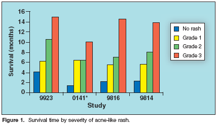 About 75% of patients developed arash. In all four studies, patients withno rash had the shortest median survival,while patients with grade 3 rashlived longest (see Figure 1). In patientswith pancreatic cancer, for example,the range for length of survival wentfrom 2.3 months with no rash to 13.9months with grade 3 rash.So far the rash has been treatable aswell as controllable with dose adjustment,Dr. Saltz said. He voiced a concern,however, that the finding "impliesa relatively modest therapeuticwindow whereby we're going to haveto accept the skin toxicity to get whatwe want out of the drug."