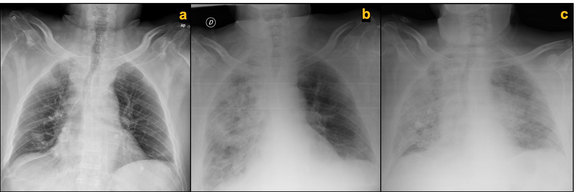 Figure 1. Chest x-ray comparison of normal study 1 month prior to admission, (A) at time of respiratory symptoms initiation showing bilateral patchy infiltrates with right lung predominant distribution, (B) and 48 hours after treatment initiation at time of symptoms aggravation consistent with progression of bilateral lung infiltrates (C).