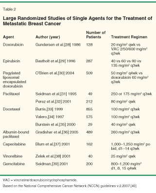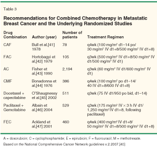 Overviews of chemotherapies in metastatic breast cancer recommended by the National Comprehensive Cancer Network (NCCN) are included in Table 2 (single agents) and Table 3 (combinations).