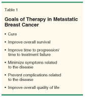 The main treatment modality for metastatic breast cancer is systemic therapy, which is administered to achieve one or more aims (Table 1). The ultimate goal of treatment in both the adjuvant and metastatic settings is cure. However, the majority of patients with advanced breast cancer will experience disease progression within 12 to 24 months after treatment initiation, and only a minority (1%–3%) are expected to survive 20 years.[4]