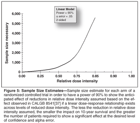 It is reasonable to ask why there have not been more controlled clinical trials investigating the impact of reductions in dose intensity and the value of sustaining full dose intensity on long-term outcomes. Randomization between the dose and schedule shown to be effective in randomized controlled trials vs a regimen or schedule at considerably lower dose intensity that will likely be less effective raises important ethical concerns for both patients and oncologists. In addition, sample size or power considerations represent challenges to such trials as the number of patients needed in each arm of a trial to demonstrate the anticipated effect of a 10% to 25% reduction in relative dose intensity on patient survival number in the thousands (Figure 5). As a result, in most curative settings, large numbers of patients must be followed over many years costing millions or tens of millions of dollars.