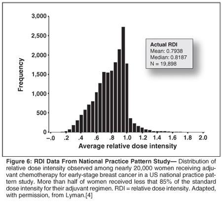 In a more recent survey between 1999 and 2002 in women with early-stage breast cancer, some 30% received less than 85% of standard relative dose intensity.[43] In multivariate analysis, significant independent predictors of reduced dose intensity included an episode of febrile neutropenia, greater age, body surface area > 2 m2, type of chemotherapy (particularly the use of anthracyclines-based regimens), and the number and type of comorbidities (particularly renal disease). After adjustment for these factors, primary prophylaxis with a colony-stimulating factor was associated with less reduction in dose intensity.