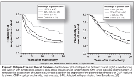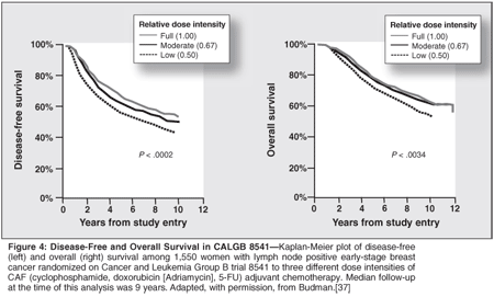 Two randomized controlled trials of adjuvant chemotherapy in early-stage breast cancer where patients were deliberately randomized to different dose intensities have been reported. A study in patients with early-stage breast cancer (Cancer and Leukemia Group B [CALGB] 8541) randomized patients to three different relative dose intensities (1.0, 0.67, 0.50) of adjuvant cyclophosphamide, doxorubicin (Adriamycin), and 5-FU (Figure 4).[37] At a median follow-up of 9 years, patients in the low dose intensity arm experienced significantly worse disease-free (P < .0001) and overall survival (P = .004) than patients in the moderate- and full-dose intensity arms respectively. Similarly, a randomized trial conducted by the French Adjuvant Breast Cancer Group demonstrated a regimen of 5-FU, epirubicin (Ellence), and cyclophosphamide was superior in terms of 10-year disease-free (50.7% vs 45%; P = .036) and overall survival (54.8% vs 50.0%; P = .038) when epirubicin was given at a dose of 100 mg/m2 rather than 50 mg/m2, respectively.[38]