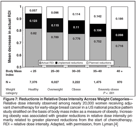 At least half of the reductions in chemotherapy dose intensity observed in national practice surveys are planned from the beginning of the treatment regimen. While all of the reasons for this intentional reduction in standard treatment doses and schedule are not clear, one frequent reason relates to the general incorporation of patient weight, usually in the form of body surface area, to calculate the dose to be administered. Multiple studies, including those discussed above, have demonstrated that reductions in standard dose intensity are frequent in overweight and obese patients (Figure 7).[4,44,45] Such modifications are frequent despite the consistent and prevailing evidence that obese individuals treated on the basis of actual body weight experience no greater hematologic toxicities than healthy weight individuals.[46]