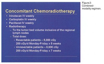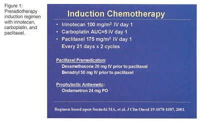 Twenty patients with histologically documented stage III NSCLC and no prior chemotherapy or chest radiotherapy were enrolled. The planned phase I treatment schema was induction chemotherapy with irinotecan/paclitaxel/carboplatin (Figure 1) followed by concomitant chemoradiotherapy with irinotecan/paclitaxel/carboplatin/radiation (Figure 2). "A third step of surgery, if feasible, was added because some patient became resectable as a result of chemoradiotherapy," Dr. Mauer said.