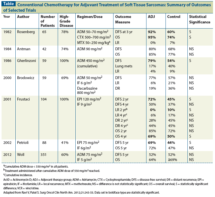 Use of systemic chemotherapy in the management of localized soft-tissue sarcomas remains controversial even after evaluation of results of multiple clinical trials conducted over a period of 25 years. The primary goal of neoadjuvant/adjuvant therapy is to reduce the risk of local and distant recurrences, eventually resulting in prolonged OS within the treatment group. The Table highlights some of the trials that have explored the utility of adjuvant systemic therapy in soft-tissue sarcomas.