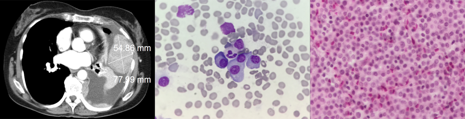A 70-year-old woman with no history of smoking or asbestos exposure presented with dyspnea on exertion, nonproductive cough, left-sided pleuritic chest pain, and fatigue. Chest radiography revealed a large left pleural effusion and a mass in the left lower lobe. Chest CT confirmed a pleural-based mass of 7.8 × 5.5 cm invading the anterior chest wall. A left-sided thoracentesis revealed a bloody, lymphocyte-predominant exudative pleural effusion, with a white blood cell count of 8,144/μL (26% lymphocytes, 2% neutrophils, 3% monocytes, and 69% other cell-line types). A cytologic examination of the pleural fluid and a biopsy of the pleural mass were performed, followed by aspiration and biopsy of the bone marrow.