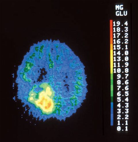 FDG-PET scan of the brain showing a malignant tumor; area in red indicates glucose uptake. Childhood survivors of brain tumors who undergo radiation therapy often experience late-term cardiotoxicity, according to the results of the Childhood Cancer Survivor Study.