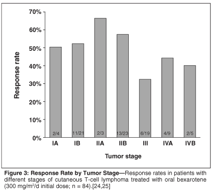 Among 84 patients who were treated with bexarotene (300 mg/m2/d initial dose), good response rates (ranging from 32% to 67%) were achieved across all tumor stages (Figure 3).[24,25] This seems to be an underestimate of the usual effects observed in clinical practice. The median survival time of a group of 94 heavily pretreated patients with stage IIb-IVb CTCL treated with similar doses of bexarotene was just under 1 year, and some patients showed a sustained response for as long as 6 or 7 years.[25]