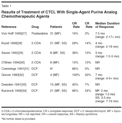 30. O'Brien S, Kurzrock R, Duvic M, et al: 2-Chlorodeoxyadenosine therapy in patients with T-cell lymphoproliferative disorders. Blood 84:733-738, 1994.