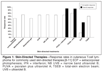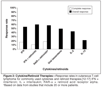 Patients are candidates for non-skin-directed therapies: if they present with high-stage disease (stage IIB or greater); their disease has progressed; or they have dose-limiting toxicities, particularly melanoma, skin atrophy, or photosensitivity. The first choice for systemic agents would be cytokines or rexinoids. The overall response rates to these treatment modalities are acceptable, but rates of complete response are much lower than those produced by skin-directed therapies in early-stage disease (Figure 2).[12-17]