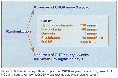 "), which compared the classic CHOP regimen with R-CHOP. The open-label trial enrolled 400 previously treated elderly patients (age range: 60-80 years) who were randomized between R-CHOP and CHOP (see Figure 1).