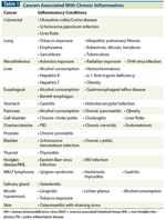 Epidemiological evidence firmly supports a link between chronic inflammation and cancer that occurs in various organs (Table 1). The inflammatory conditions implicated are quite diverse; they include a wide array of chronic infections, exposure to noxious agents that trigger inflammation (eg, gastric acid reflux, tobacco, asbestos), and auto-immune conditions. Inflammation-associated cancer consists of white blood cells, notably tumor-associated macrophages (TAM) and T lymphocytes; increased generation of reactive oxygen species (ROS)/reactive nitrogen species (RNS); altered cytokine/chemokine expression; and augmented molecular signaling via nuclear factor kappa B (NFκB), signal transducer and activator of transcription proteins (STATs), cyclooxygenase-2 (COX-2), and others.[reviewed in 2-8] In this section we focus on two widely studied cancers linked to chronic inflammation: colorectal cancer and lung cancer.