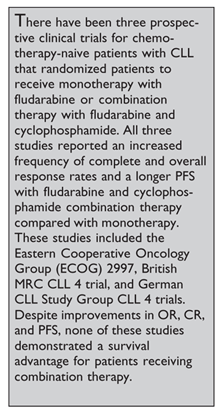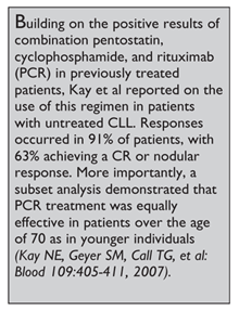 Using a sequential approach with these two agents, the group at Memorial Sloan-Kettering Cancer Center has shown that consolidation therapy with high-dose cyclophosphamide with and without rituximab markedly improves the frequency of a CR over fludarabine alone.