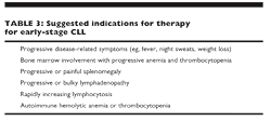 Since patients with early-stage CLL have a good long-term prognosis, and early therapy has not changed the outcome of the disease, patients in the early stages should not be treated unless specific indications exist (Table 3). Randomized trials comparing chlorambucil versus no therapy have documented no advantage for patients with early-stage CLL who received immediate therapy with chlorambucil. New alternatives for treatment of high-risk early-stage CLL (ZAP-70–positive, unmutated IgH status) are being investigated (eg, monoclonal antibodies).
