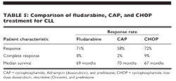 The addition of prednisone or chlorambucil to fludarabine therapy did not improve the response rate and is associated with an increased incidence of opportunistic infections and other toxicities. A large randomized study comparing fludarabine, CAP, and CHOP demonstrated an increased response rate with fludarabine but no difference in survival (Table 5). Randomized trials of fludarabine versus chlorambucil in previously untreated patients showed improvements in response rate (overall and CR), duration of response, and disease progression-free survival with fludarabine but no survival advantage.