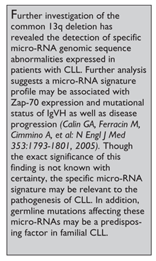 A number of recurrent cytogenetic abnormalities have been identified in CLL. Most have not been associated with a specific gene defect or abnormality; however, their detection is prognostically important, and work continues toward identifying the associated gene or genes.