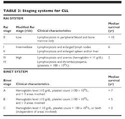 Staging systems Two staging systems of CLL are commonly used: one proposed and later modified by Rai and the other proposed by Binet (Table 2). Both systems include three categories of low, intermediate, and high risk, with median survival durations of approximately 10, 6, and 2 years, respectively.