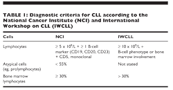 Peripheral blood The most consistent feature of CLL lymphocytosis, with median values of 30–50 × 109/L. The lymphocytes are small and mature-appearing, with little cytoplasm and clumped chromatin. A few larger nucleolated cells, which represent prolymphocytes, usually constitute < 10% of the total lymphocytes. Diagnostic criteria for CLL defined by the National Cancer Institute (NCI) and International Workshop on CLL (IWCLL) are presented in Table 1.
