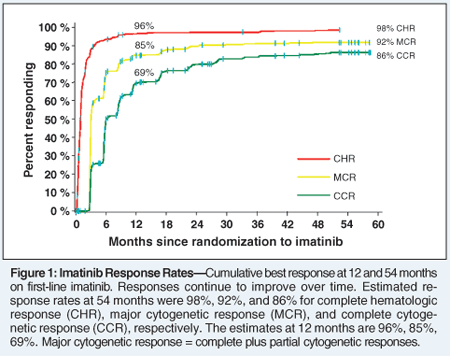 At the time of the initial interval IRIS results, we had limited information on the durability of the remissions, the impact on survival, and the nature of resistance. With almost 5 years of follow-up since the start of the IRIS study, the natural history of the disease with imatinib therapy is better articulated. Complete hematologic response rates have surpassed 90%, and over 86% of newly diagnosed CML patients have achieved a complete cytogenetic response, with an additional 6% developing a partial cytogenetic response while on imatinib (Figure 1).[25] Since the outset of the IRIS trial, approximately 4% of patients have developed resistance or progression annually. These risks are reduced among patients with a complete cytogenetic response, but significantly increased in those who do not have at least a partial cytogenetic response. With only 5 years of follow-up, the long-term outcome of therapy is still unknown, but the impact of imatinib on survival, thus far, appears to be dramatic.