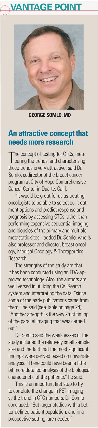 “The results of CTC enumeration are more reproducible, seem to predict survival more robustly, and yield useful results earlier than radiographic evaluation,” the authors wrote. “Detection of five or greater CTCs during therapeutic monitoring can accurately predict prognosis in MBC beyond functional response assessed by FDG-PET/CT. FDG-PET/CT deserves a predictive role in instances of patients with less than five CTCs at midtherapy” (J Clin Oncol 27:3303-3311, 2009).