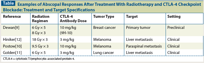 Table: Examples of Abscopal Responses After Treatment With Radiotherapy and CTLA-4 Checkpoint Blockade: Treatment and Target Specifications