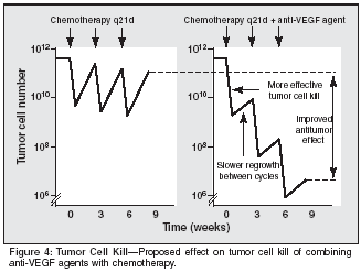 The Norton-Simon hypothesis predicts that the addition of any effective anticancer agent to chemotherapy could produce improved results by limiting tumor regrowth between cycles. Anti-VEGF agents are not believed to be cytotoxic on their own, but rather inhibiting tumor growth through their effects on neoangiogenesis is one underlying mechanism of action.[6] Specifically, anti-VEGF agents are thought to starve tumors by inhibiting their ability to maintain newly developed vasculature and to recruit a blood supply. These steps are necessary for continued tumor growth.[3] By altering the growth pattern of the tumor and preventing regrowth of a regressing tumor, the addition of anti-VEGF agents to chemotherapy regimens may result in improved clinical outcomes, without requiring a reduction in the chemotherapy dosing interval. Moreover, anti-VEGF agents likely enhance the cytotoxic effects of chemotherapy. Anti-VEGF therapy has been demonstrated to normalize the disorganized and dysfunctional tumor vasculature, resulting in increased intratumoral chemotherapy levels.[14,15] In addition, the demonstrated ability of anti-VEGF agents to reduce the high interstitial fluid pressure of the tumor[16] may result in improved chemotherapy delivery to the tumor center where this pressure is highest.[17] By improving chemotherapy delivery to the tumor, anti-VEGF agents could increase tumor cell kill rates. In the pivotal trial conducted in patients with colorectal cancer, survival was improved for patients receiving IFL (irinotecan [Camptosar], fluorouracil, leucovorin) chemotherapy plus bevacizumab relative to those receiving IFL alone.[6] Theoretical tumor regression curves illustrate the hypothesis that adding anti-VEGF agents alters the tumor growth pattern, improves intratumoral chemotherapy delivery, and results in improved rates of minimal residual disease and possibly disease eradication (Figure 4). Dose-Dense Chemotherapy Combined With Anti-VEGF TherapyPotential Therapeutic Synergies