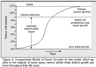 Vascular endothelial growth factor (VEGF) is a potent stimulator of angiogenesis. It is expressed throughout the angiogenic process and is crucial for tumor growth and metastatic spread.[1-3] VEGF expression is upregulated in a broad array of tumor types, and this overexpression translates into poorer survival in many human cancers.[4] Given the multiple targets in the VEGF pathway and the potential for improving outcomes in a broad range of human malignancies, numerous anti-VEGF agents are in development. These include antibodies to VEGF, soluble VEGF receptors (VEGFRs), antibodies to some or all of the VEGF receptors, antisense oligonucleotides, and small-molecule inhibitors of VEGFR.[5] One anti-VEGF therapy, a humanized monoclonal antibody to VEGF (bevacizumab [Avastin]), has been approved by the US Food and Drug Administration (FDA). The clinical success (ie, increased patient survival) of this agent in conjunction with chemotherapy in the treatment of patients with colorectal cancer demonstrates that angiogenesis inhibition, and specifically VEGF inhibition, is a viable therapeutic approach.[6] Maximizing the potential of agents that target the VEGF pathway involves investigating a range of doses and administration schedules in combination with chemotherapy.[7] In this article, we explore concepts related to the integration of anti-VEGF agents into chemotherapy regimens and postulate that these agents may alter tumor growth in a manner consistent with the Norton-Simon hypothesis,[8] resulting in improved cytotoxicity, reduced regrowth between cycles, and prolonged survival. Evolving Concepts in Cytotoxicity At the dawn of the modern chemotherapy era, much of the rationale for administering chemotherapy came from kinetic modeling of the response of murine leukemia L1210 to curative chemotherapy.[9] L1210 is a rapidly and almost exponentially growing tumor, with all of its cells progressing through the cell cycle at any given time. The cytotoxic effects of chemotherapy follow log-kill kinetics in this model. If a dose of chemotherapy reduced the tumor burden from 109 to 108, the same dose would therefore reduce the burden from 104 to 103 (Figure 1). Although the vast majority of human tumors have a smaller growth fraction than that of rodent leukemia L1210, this work fostered widely held beliefs that the ratio of proliferating cells to total cells remains constant, tumor growth is logarithmic, and cell kill is proportional regardless of tumor burden. While the exponential growth model is attractive for its simplicity, most human cancers do not exhibit purely exponential growth.[10] Rather, human cancers appear to follow a Gompertzian model of growth.[10] Here, the ratio of proliferating cells to total cells decreases with increasing tumor size. The growth fraction declines exponentially over time, and a plateau phase can be observed in some malignancies.[ 10] As a result, the tumor growth curve has three distinct regions: a slow initial phase, a middle phase characterized by rapid growth, and a slow plateau phase (Figure 2).[10] In a Gompertzian model, chemotherapy, which targets rapidly proliferating cells, kills a small fraction of cells when the cancer is advanced and the tumor is large, but a higher fraction of cells when the tumor is small or when the cancer is clinically undetectable. This explains, in part, the relatively greater effectiveness of adjuvant therapy compared with treatment for metastatic disease.