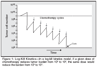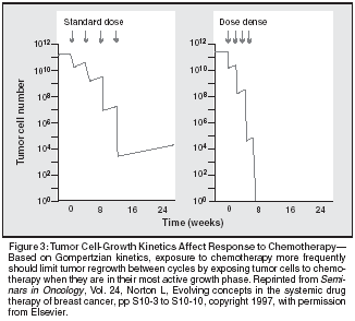 Another important consideration with Gompertzian growth is the impact of residual tumor cells on tumor regrowth. The regrowth of residual cells is fastest at small tumor volumes, meaning that clinically significant regrowth might occur between cycles of conventionally scheduled chemotherapy. This growth property may explain the challenges inherent in designing curative adjuvant chemotherapy regimens for many types of cancer, including breast cancer. Attempts to eliminate residual disease and improve survival by increasing chemotherapy dose intensity through dose escalation have not proven particularly effective.[11] However, with the advent of colony-stimulating factors, it became possible to decrease the time interval between chemotherapy cycles (dose-dense chemotherapy). Based on his extensive work with Gompertzian kinetics, Norton proposed that administering an appropriate and effective dose of chemotherapy more frequently would limit tumor regrowth between cycles, thereby providing a more effective way of treating residual disease (Figure 3).[11] Building on a series of pilot studies, the Cancer and Leukemia Group B (CALGB) tested this hypothesis in Intergroup trial C9741.[12] In this randomized clinical trial, treatment with dose-dense chemotherapy improved survival relative to standard chemotherapy when administered in the adjuvant setting for the treatment of patients with node-positive breast cancer. Treatment was generally well tolerated. Severe neutropenia was less common for patients in the dose-dense arm, who received prophylactic colonystimulating factor support with each cycle as part of the treatment regimen. With the proof of principle established, other cooperative group trials are currently including dose-dense chemotherapy in randomized trials, eg, Southwest Oncology Group (SWOG) trial 0221, National Surgical Adjuvant Breast and Bowel Project (NSABP) trial B-38, and CALGB 40101. Dose-dense chemotherapy has been hailed as an important incremental advance in treatment for early-stage breast cancer.[13] Results from additional trials are needed to determine the ability of dose-dense chemotherapy to improve survival for patients with other malignancies.