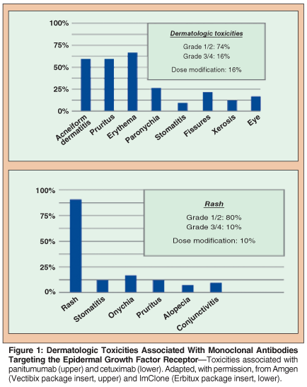 Management of dermatologic toxicities from epidermal growth-factor receptor inhibitors (EGFRIs) is best tailored to the type of skin lesions present, extent of body surface involvement, and anatomic location affected. Although few randomized trials have been undertaken to address treatment of skin, hair, or nail side effects to this class of drugs, some basic principles of therapy based on experience of referral centers can help mitigate these toxicities and ensure consistent EGFRI administration and maintenance of patient quality of life. Patient education as to the expected EGFRI side effects and early physician intervention when these side effects appear can improve outcomes. Two dermatologists who treat high numbers of patients affected by these EGFRI-induced cutaneous side effects submit their recommendations for management.