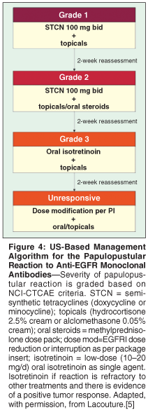 For papulopustular reactions that have not improved despite 2 weeks of high-dose (100 mg twice daily) tetracycline therapy and topical steroids, systemic steroids can be administered as an adjunct to systemic antibiotics and the topical agents. Short courses of prednisone (0.35 to 0.5 mg/kg qd) or methylprednisolone (Medrol dose pack) can be effective in controlling flares.[13] Improvement in both the symptoms and extent of skin lesions are observed within a few days. Failure to improve after this step has been taken should lead to EGFRI dose interruption for 14 days or until the rash is ≤ grade 1 in severity, at which point reescalation should be intitiated in accordance with package insert recommendations. In cases where the aforementioned interventions have failed and when evidence of tumor response to the EGFRI has been demonstrated, the use of oral isotretinoin may be considered, as was reported to be effective in two cases of patients with papulopustular reactions to cetuximab (Erbitux).[14] However, little is known about the effects of isotretinoin on tumor biology or interactions with EGFRIs and this treatment should be undertaken on a per patient basis.