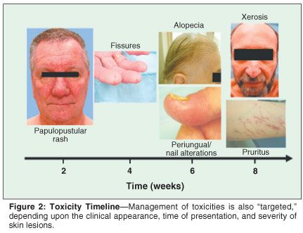 Numerous anecdotal reports on the successful management of the cutaneous side effects of EGFRI therapy have led to several controlled studies currently underway and two that have been completed (Table 1). Treatment is best tailored to the type of skin lesions, severity of the lesions, and anatomic site affected by the EGFRI treatment. Knowledge of the chronology and appearance of skin toxicities is key, as it allows for early recognition of these cutaneous side effects and ensures prompt therapy (Figure 2). A multidisciplinary approach with frequent follow-ups (every 2 to 4 weeks until resolution) is advisable[5] so that treatment is optimized and the likelihood of EGFRI drug discontinuation is minimal.