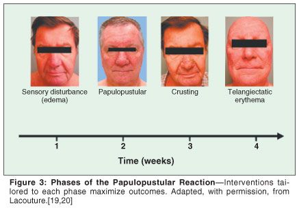 Figure 3 shows the phases generally experienced during the course of a papulopustular reaction. Clinical experience suggests that topical corticosteroids can be effective in the management of these skin reactions.[6] However, the need for high-potency formulations precludes the long-term use of topical corticosteroids on frequently affected areas, such as the face.[7] The use of colloidal oatmeal lotion (Aveeno), which has anti-inflammatory properties and a beneficial toxicity profile, resulted in four of seven patients exhibiting a complete response and three of seven experiencing a partial response.[8] The topical antibiotic clindamycin phosphate 1% gel has demonstrated favorable results, producing a drying effect on inflammatory pustules.[6] Topical retinoids, α-hydroxyacids, and benzoyl peroxide have also been reported to be effective in some cases, but use of these agents is associated with significant irritation and skin dryness and should be generally avoided.[9]