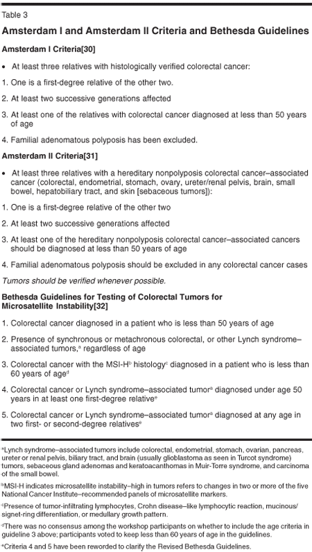 32. Laghi L, Bianchi P, Roncalli M, et al: Revised Bethesda guidelines for hereditary nonpolyposis colorectal cancer (Lynch syndrome) and microsatellite instability. J Natl Cancer Inst 96:1402-1403, 2004.