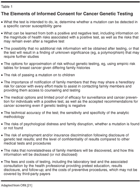With all of these advances have come a number of challenges. Among these are questions of who warrants genetic testing, how to conduct such testing, what to do with results that may or may not be definitively positive or negative, and what clinical screening to perform. Additional layers of complexity for the clinician surround the "human element": patients that are unaware of their family history, dysfunctional families that cannot work together to identify and communicate risk information to one another, and other social and psychological barriers. Finally, the economics of paying for genetic counseling, laboratory testing, and clinical screening may render most of the other considerations effectively moot. In short, comprehensive genetic counseling is central to most cases of familial cancer predisposition. The key elements of genetic counseling should be addressed; one well-considered tabulation of these elements is reproduced in Table 1.